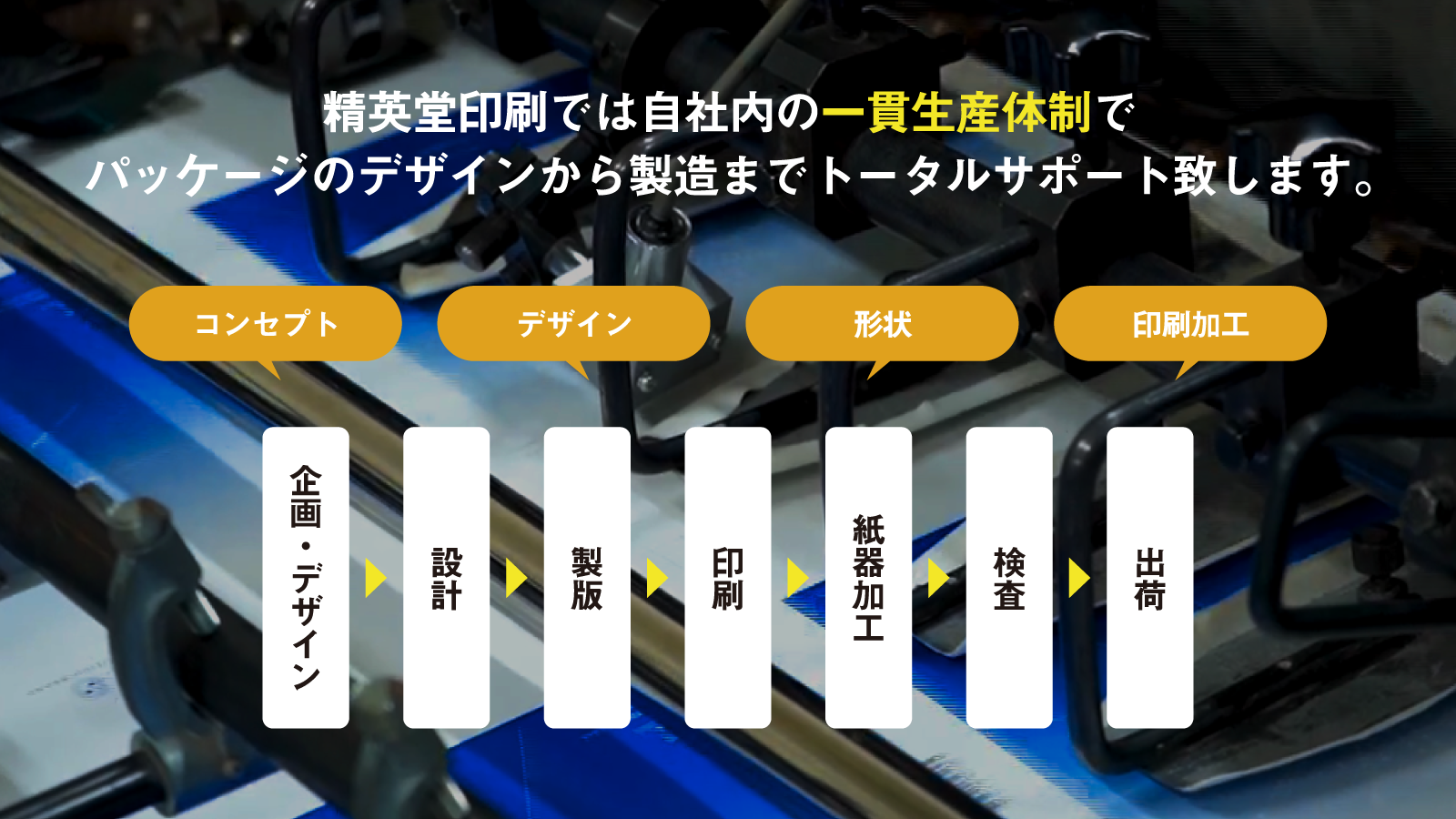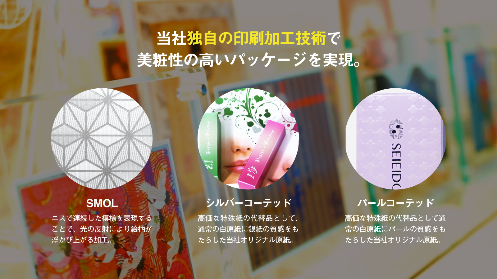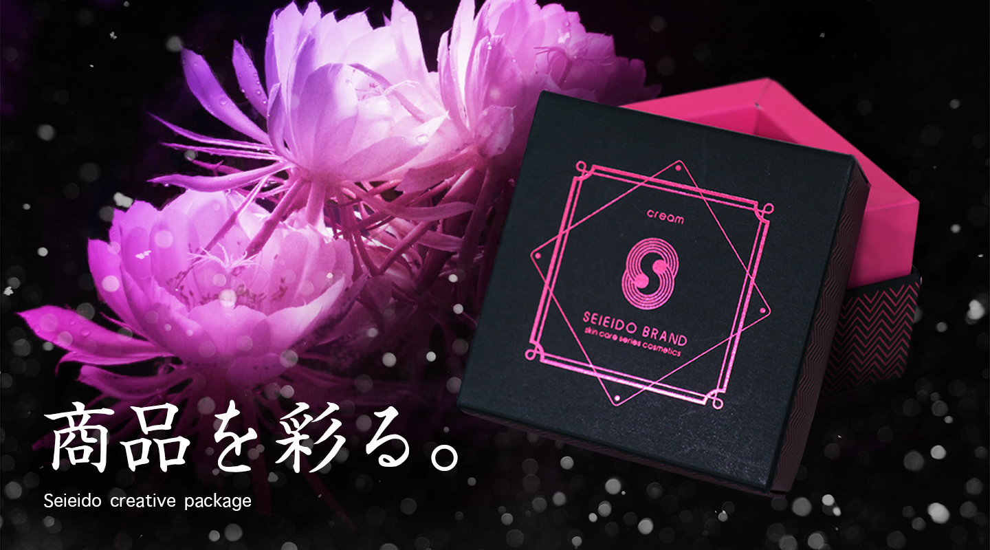 お客様の商品の意匠を創造することが事業である弊社は、印刷の仕上がりの質のみならず、商品の顔となるパッケージデザインにも力を入れています。箱やシールの形状は、消費者の目を引き付けたり、使用した際の快適さを与えたりします。そんな形状に、商品を魅力的に発信するデザインを付与し、多彩な加飾技術を施すことで、お客様の商品力を高めていきます。形状・デザイン・印刷技術の三位一体となった弊社のパッケージは「SEIEIDO BRAND」として多くの業界のお客様に支持されております。