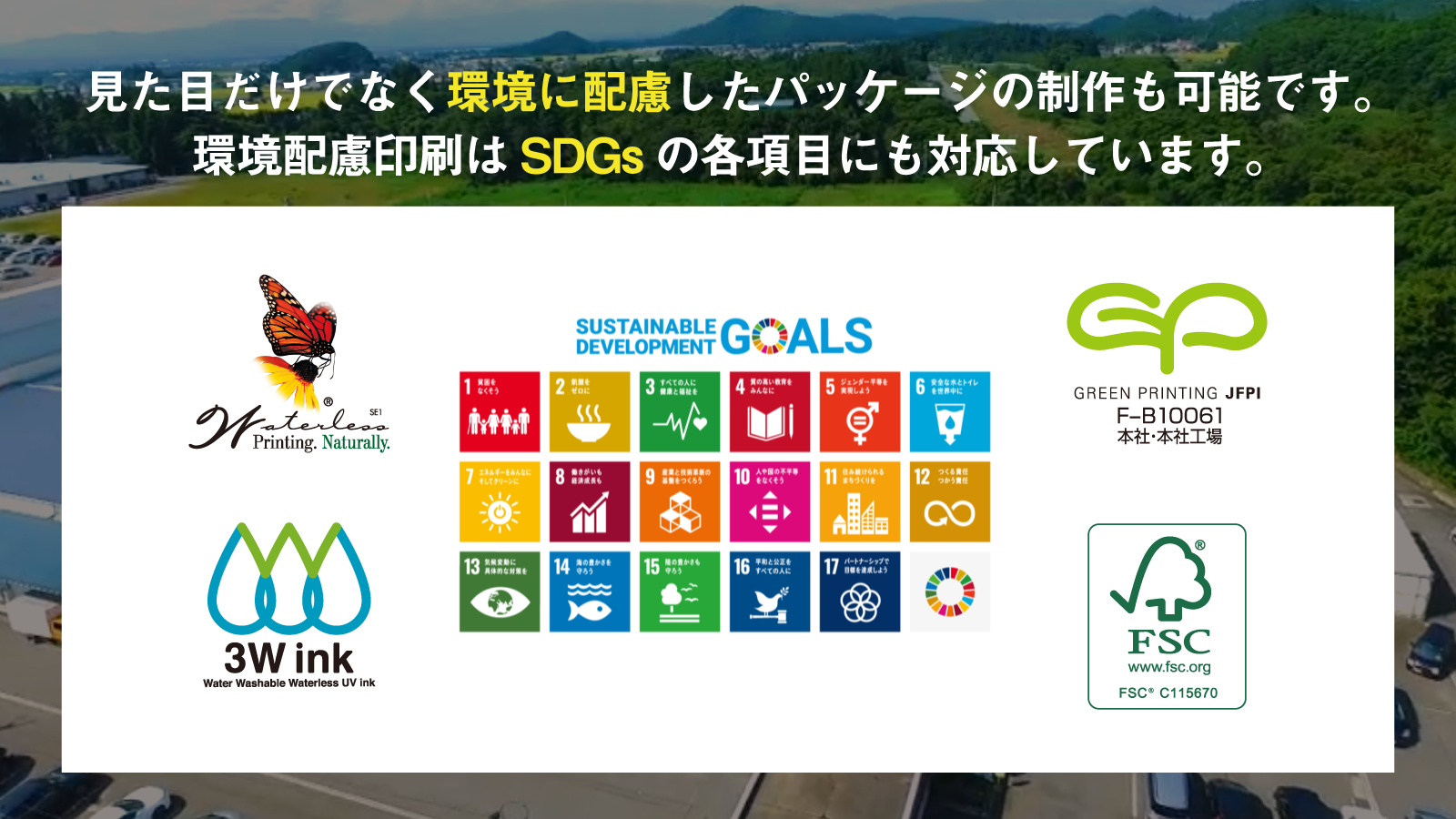 また長年パッケージの環境対応にも取り組んでおり、原紙やインキ、印刷方式にいたるまでパッケージの環境配慮をトータルでご提案致します。