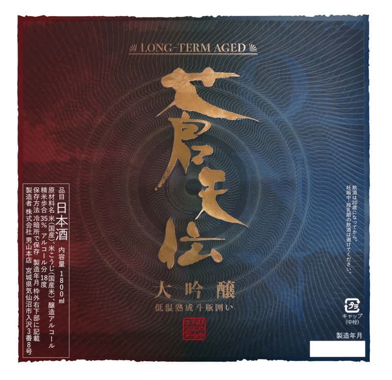 宮城県気仙沼市 株式会社男山本店様の「低温熟成斗瓶囲い大吟醸 蒼天伝 1.8L」のラベルです。
