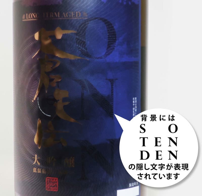 背景には光の反射で模様が浮き出すチェンジング効果で「SO-TEN-DEN」の文字を入れ、見る角度によって違った顔を魅せる、深みのあるラベルに仕上げました。