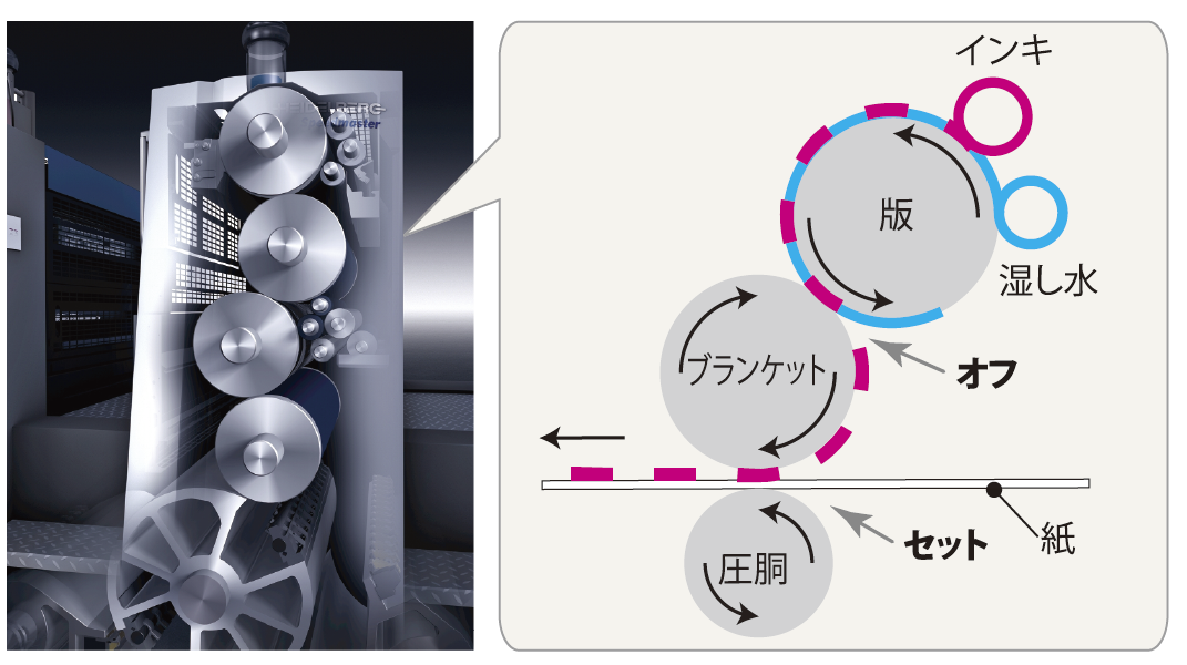 オフセット印刷は版を使いますが、紙に直接触れさせて印刷することはありません。一旦ブランケットというゴムのローラーにインキを移して紙に転写させ繊細な表現を可能にしているのです。またインキのかけ合わせ具合は版によって細かく調整されているので、色のブレや濃度変化を極力抑え、大量に印刷することが可能です。