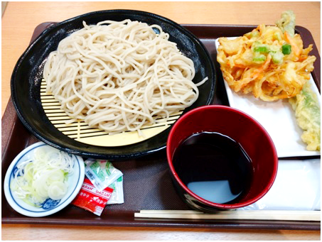 「ざるそば」に「かき揚げ」と「アスパラの天ぷら」を付けました。