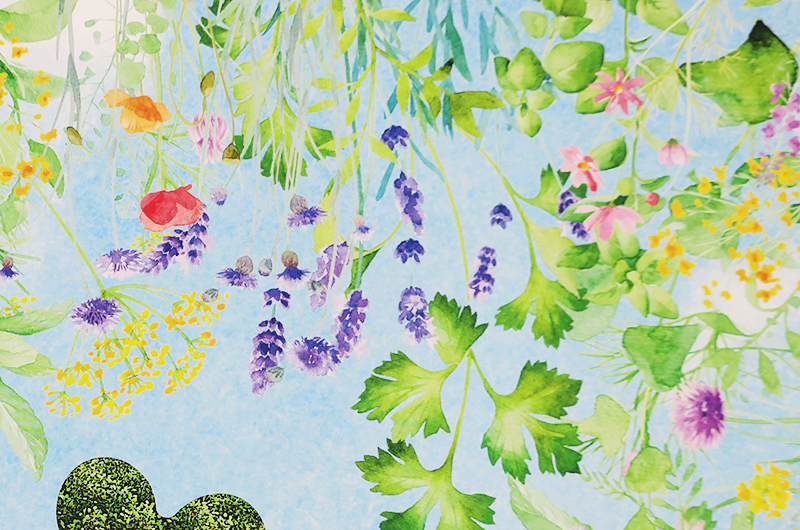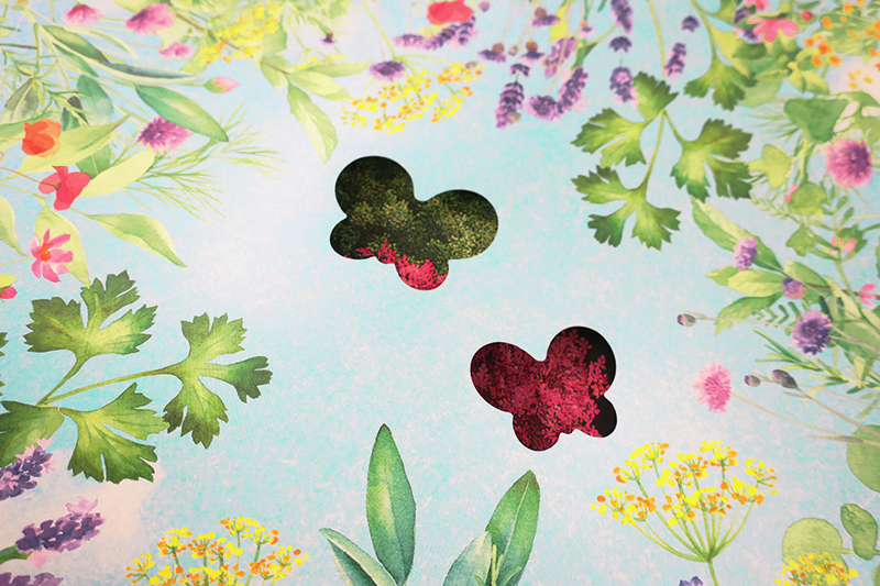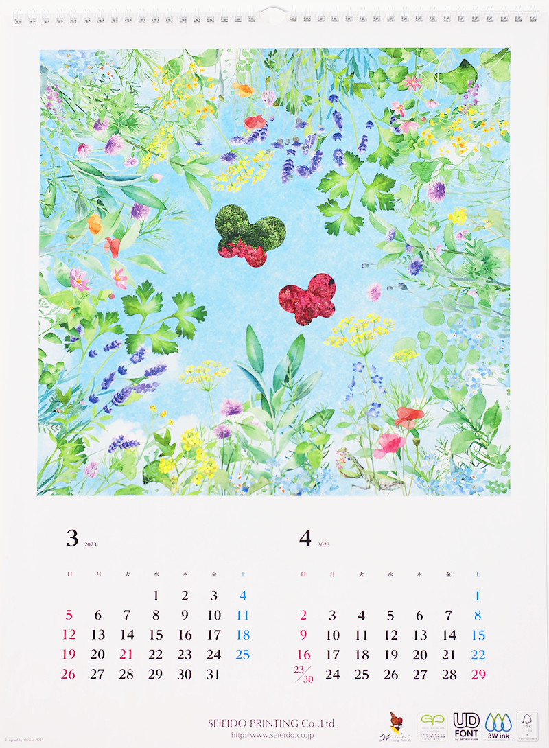 春の訪れを感じさせるような絵柄が魅力的な今回のカレンダーですが、こちらは鮮やかな印刷の上にマット感のあるニス加工を施すことで、水彩風の絵柄に合う柔らかい雰囲気を表現しています。