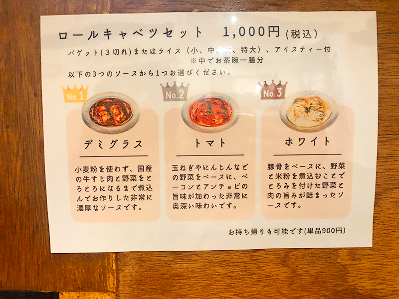 メニューもロールキャベツのみで、ソースを3種類から選ぶというとてもシンプルなメニューです!