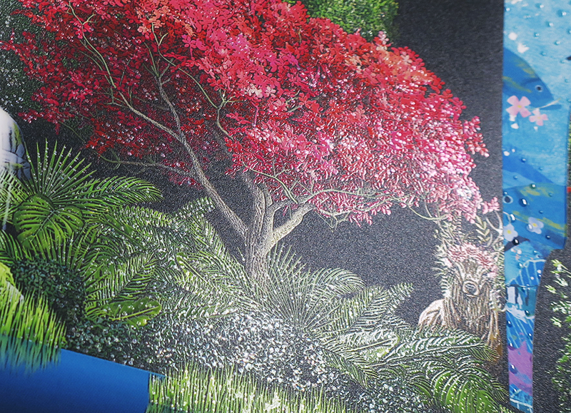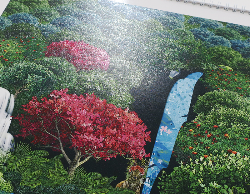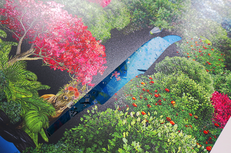 表面に発泡ニス加工を施すことによって、手触りも絵柄に沿ったザラッとした質感に変えています。